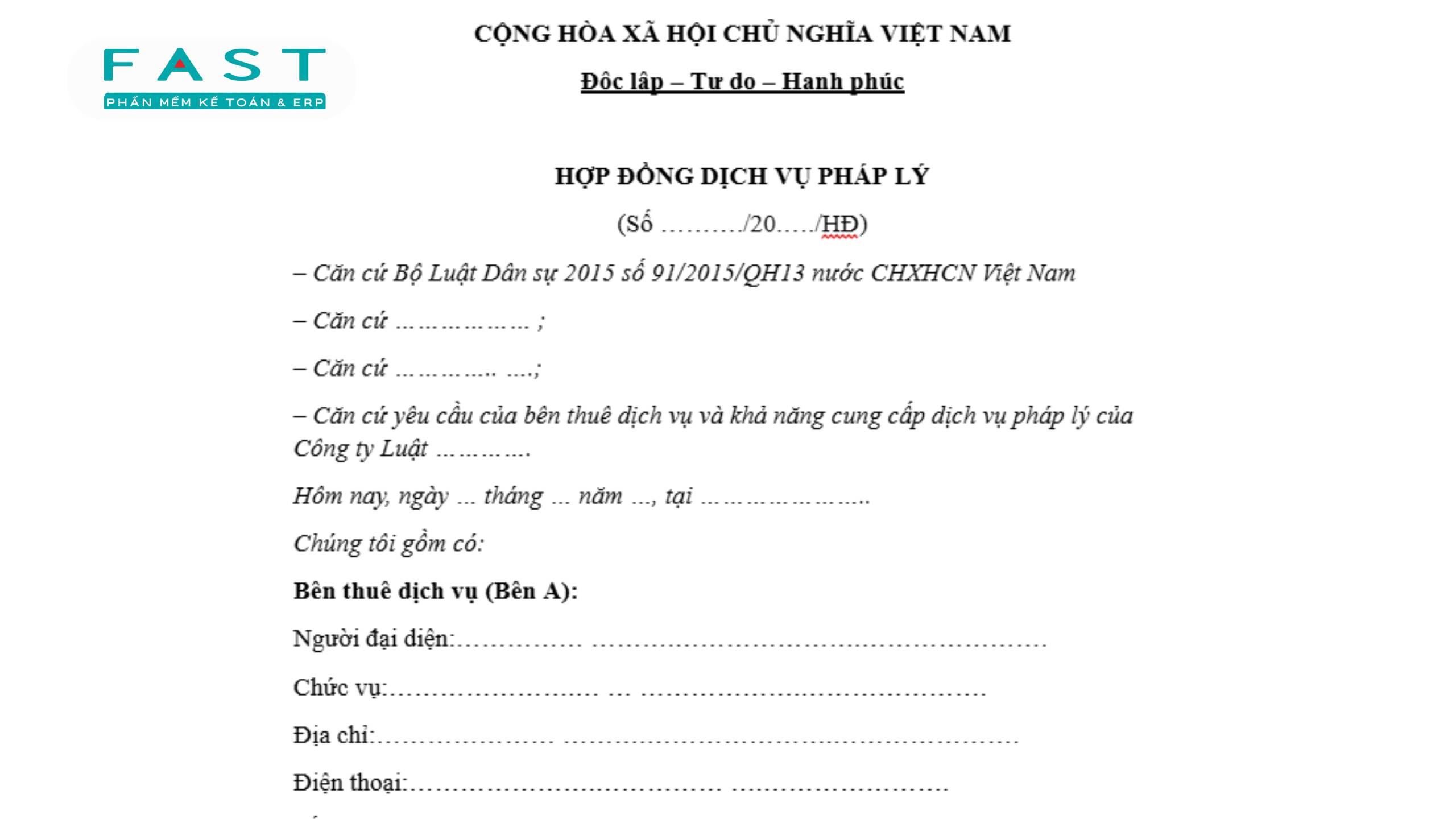 Trong hoạt động kinh doanh, hợp đồng dịch vụ là một trong những loại hợp đồng được sử dụng phổ biến nhất, giúp xác định rõ quyền, nghĩa vụ và trách nhiệm giữa bên cung cấp và bên sử dụng dịch vụ. Việc nắm rõ khái niệm, nội dung và các quy định pháp lý liên quan sẽ giúp doanh nghiệp chủ động hơn trong quá trình ký kết, tránh tranh chấp không đáng có. Bài viết dưới đây FAST sẽ giúp bạn hiểu rõ hợp đồng dịch vụ là gì, đồng thời giới thiệu 4 mẫu hợp đồng dịch vụ chuẩn pháp lý thường gặp để dễ dàng áp dụng trong thực tế.