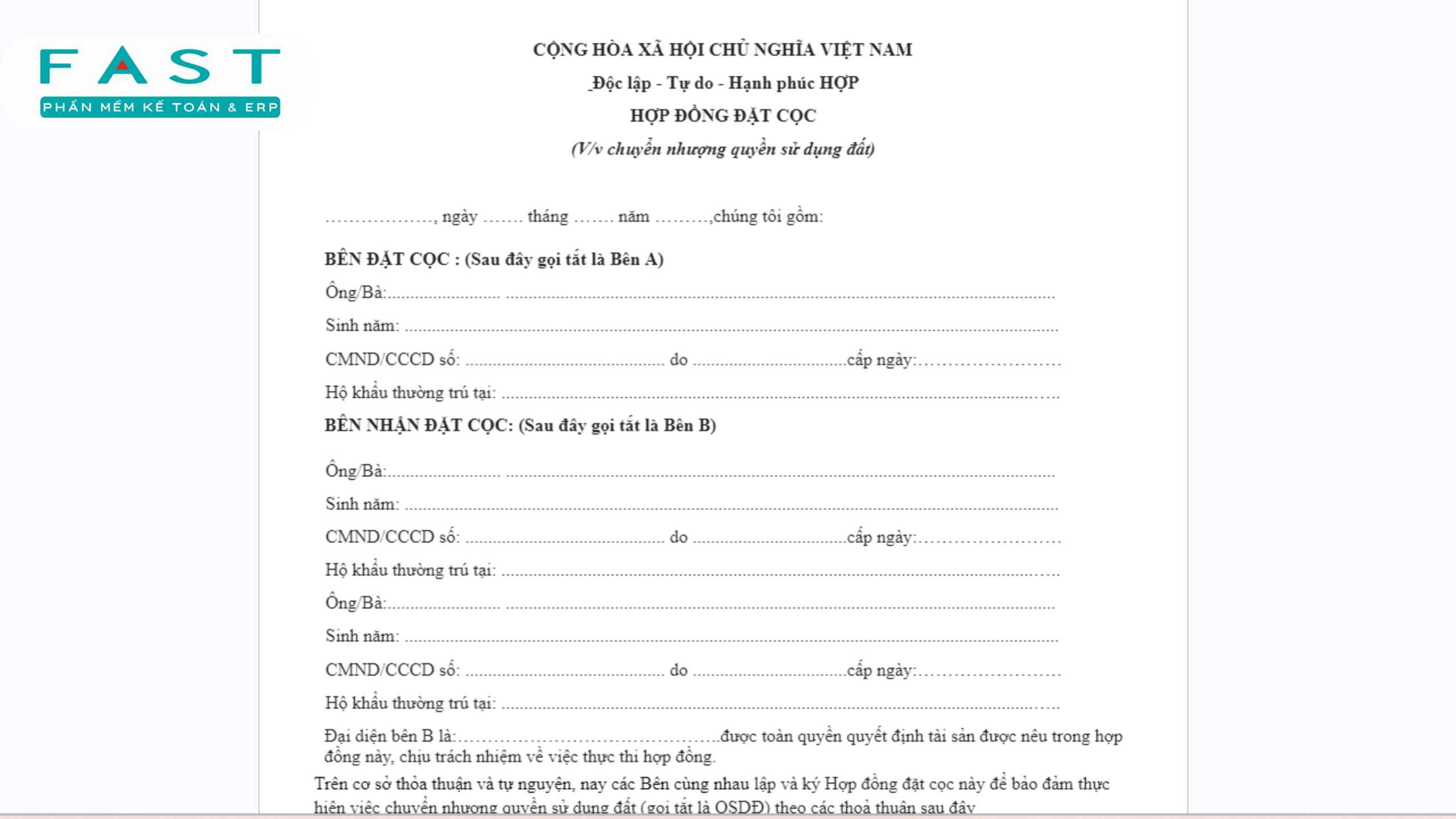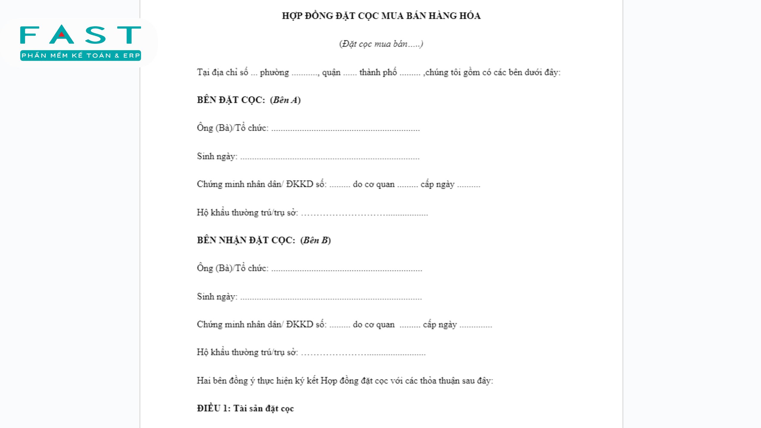 Việc soạn thảo mẫu hợp đồng đặt cọc tiền mua hàng đóng vai trò quan trọng trong hoạt động kinh doanh, giúp các bên bảo đảm quyền lợi và hạn chế rủi ro khi giao dịch. Cùng FAST khám phá bộ mẫu hợp đồng đặt cọc tiền mua hàng từ đơn giản đến chi tiết, giúp doanh nghiệp dễ dàng áp dụng, quản lý và số hóa quy trình hợp đồng một cách an toàn, minh bạch và hiệu quả.