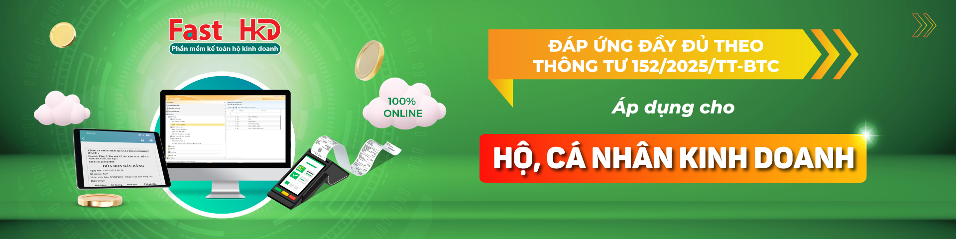 Fast HKD có chi phí hợp lý, phù hợp với hộ kinh doanh cá thể. Phần mềm đáp ứng đầy đủ nghiệp vụ, sổ sách, chứng từ theo Thông tư 152/2025/TT-BTC, Thông tư 40/2021/TT-BTC.